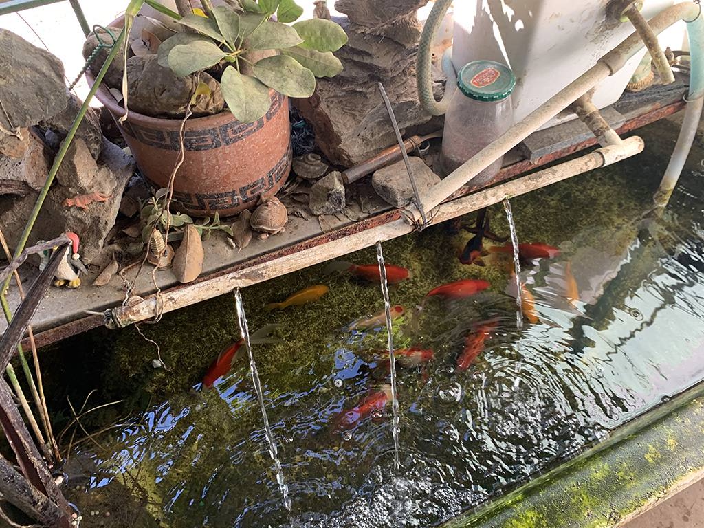 A heron comes to fish by drawing its wings together to shape an umbrella and create shade so it can see the fish. The heron into a garden to steal away the fish—scratches at the fish, wounds them, but can’t quite pick them up, so the pond is being lowered to keep them out of reach.