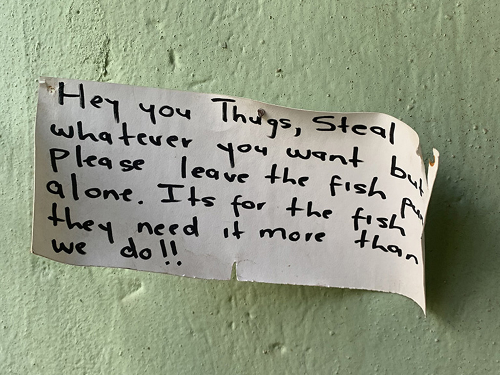 Fish live and work in a bathtub pond in the backyard garden of Mr. King’s cage. They are kept for decorative purposes, beneath a sign that implores thieves not to steal their water pump. There is a spherical glass object at the edge of their pond in which they can see a reflection of the world. They do not know that a heron dreams of them for dinner.