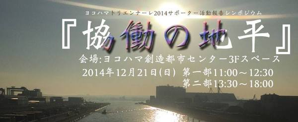 これらの本展での活動を振り返ると共に、ヨコトリ2014での取組みを通して芸術文化や現代アートの国際展における市民の関わりをまとめ、今後のサポーター活動の展開に向けて協働のあり方を議論するシンポジウムを開催します。 ディスカッションから見えてくる、芸術文化における市民協働の新しいあり方とは。 そして市民協働の姿の一つとしての「横浜モデル」とは。 サポーター活動に参加された方も、これから参加を希望される方も、ぜひご参加ください!!『協働の地平』~ヨコハマトリエンナーレ2014サポーター活動報告シンポジウム~ 【日 時】2014年12月21日(日) 第1部 11:00〜12:30 第2部 13:30〜18:00 【会 場】ヨコハマ創造都市センター YCC 【参加費】無料 【定 員】100名 【主 催】横浜トリエンナーレ組織委員会 横浜トリエンナーレサポーター事務局 【共 催】ヨコハマ創造都市センター(公益財団法人横浜市芸術文化振興財団)